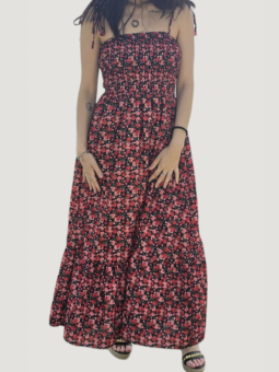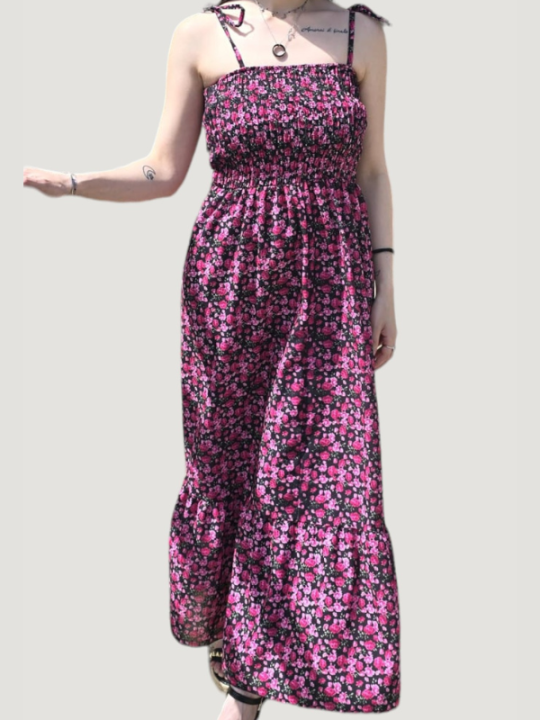 Abito lungo con elastico in vita, spalline regolabili, con fantasia fiori, veste da una XS (38 ita) ad una XL (46 ita).