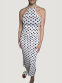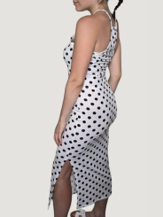 Abito lungo bianco aderente con pois neri e spacco laterale.