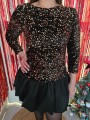 Abito nero manica lunga, con parte superiore ricoperta da paillettes oro, parte inferiore con gonna a palloncino.