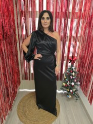 Abito lungo elegante, effetto raso, monospalla, con scollatura asimmetrica, manica lunga con spacco laterale fino al polso. Polsino stretto.