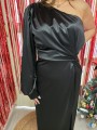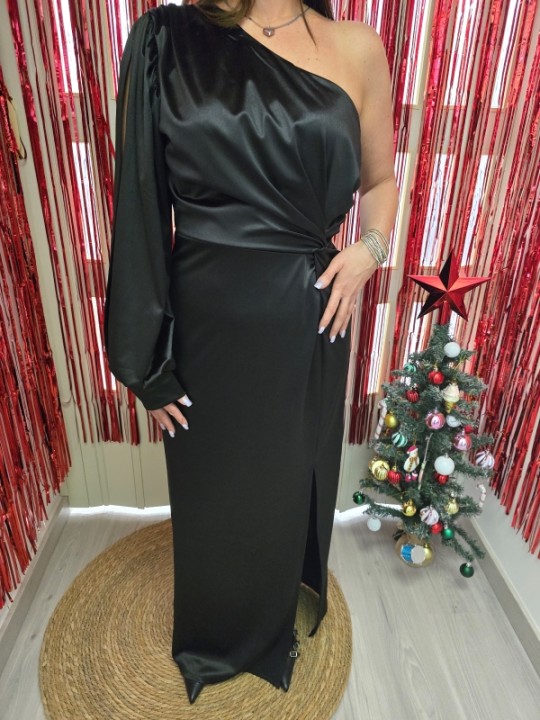 Abito lungo elegante, modello effetto raso, monospalla, con scollatura asimmetrica, manica lunga con spacco laterale fino al polso. Polsino stretto.