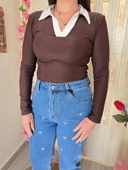 Body marrone con colletto e scollatura a V bianchi.
