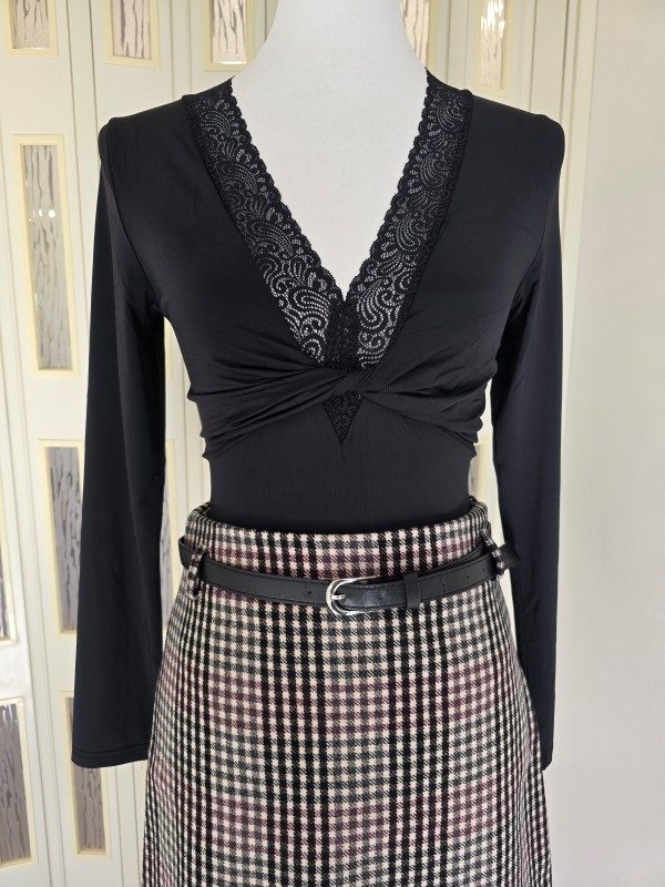Body nero, manica lunga, con scollatura a V in merletto e incrocio.