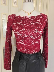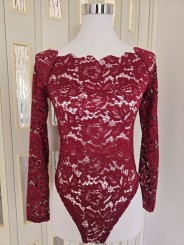 Body in pizzo rosso, scollatura a barca, manica lunga, trasparente.