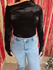 Body in velluto nero, con scollo asimmetrico arricciato, manica lunga, con fori per pollici.