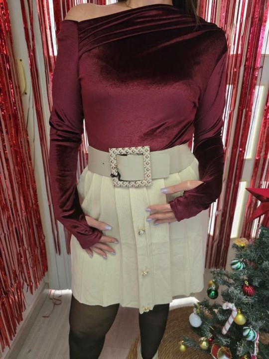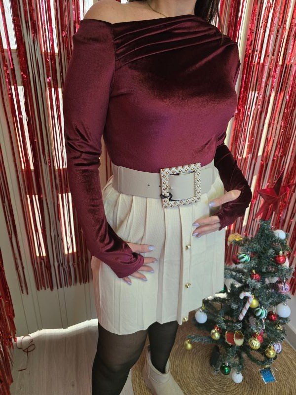 Body in velluto bordeaux, con scollo asimmetrico arricciato, manica lunga, con fori per pollici.