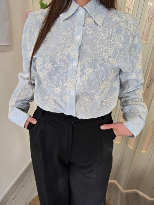 Camicia azzurra tutta ricamata, manica lunga, colletto, chiusura con bottoni.