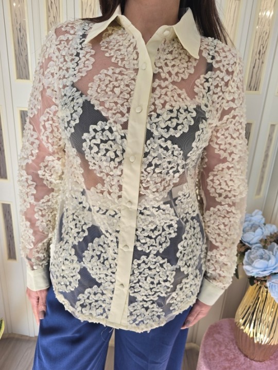 Camicia velata con effetto fiorellini, con colletto, chiusura con bottoni. Trasparente.