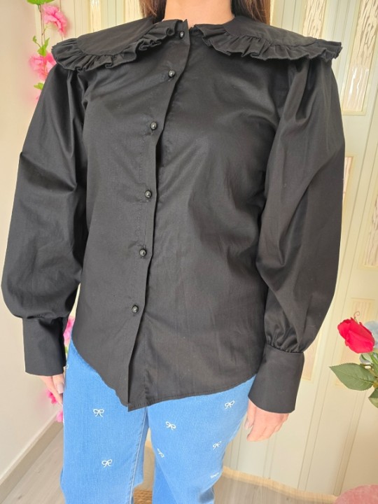 Camicia con colletto peter pan, maniche a sbuffo, polsini stretti e lunghi. Chiusura con bottoni.