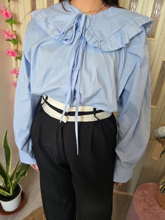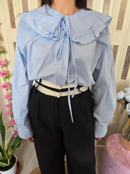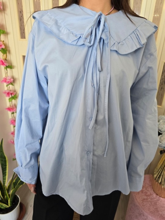 Camicia oversize con colletto peter pan e laccio annodabile a fiocco. Chiusura con bottoni, manica lunga.