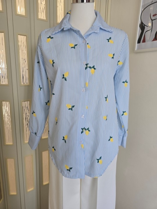 Camicia a righe, manica lunga, con fantasia limoni fronte/retro, chiusura bottoni, polsini fissi senza bottoni.