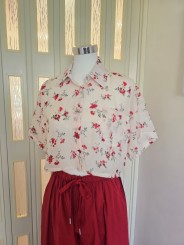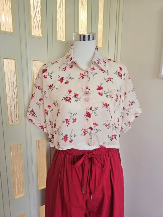 Camicia crop con fiori rossi, mezza manica, chiusura con bottoni, taschino su un lato.