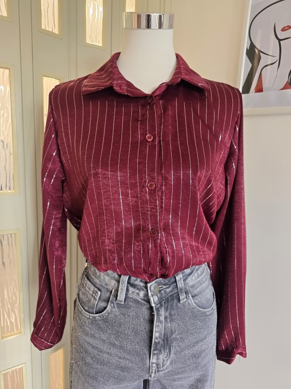 Camicia bordeaux con righe in argento, manica lunga, chiusura bottoni.