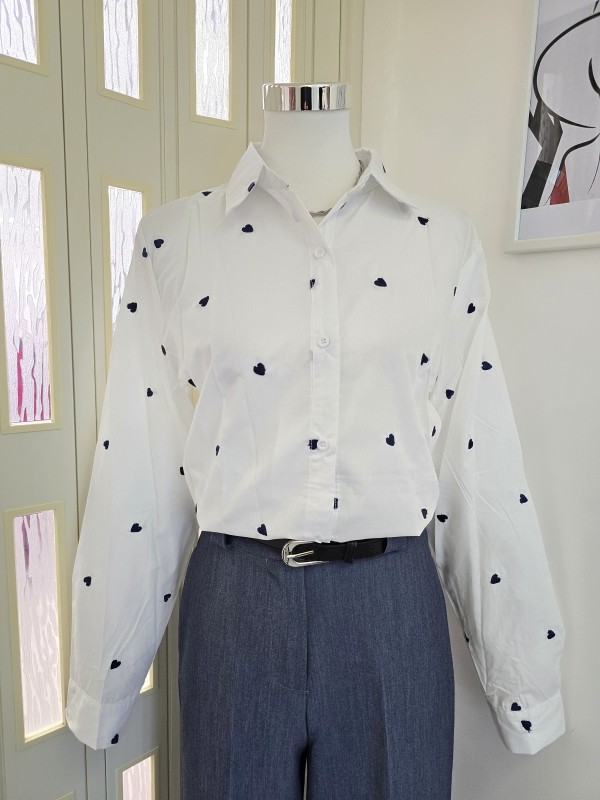 Camicia bianca decorata da cuori blu ricamati, chiusura bottoni, manica lunga.