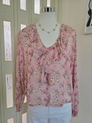 Blusa a fiori velata, modello crop, scollatura profonda a V con volant, manica lunga con polsino finale con chiusura bottone.