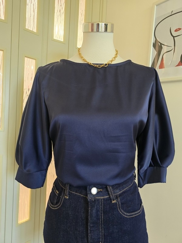 Blusa satin scollo rotondo largo, manica a 3/4 fissa.