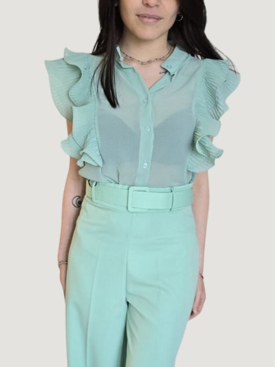 Camicia velata con maniche volant e colletto coreano in due colorazioni.
