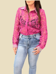 Camicia Fucsia in macramè trasparente con colletto e polsini diamanti.