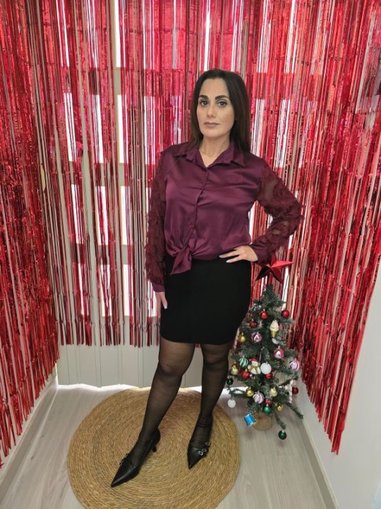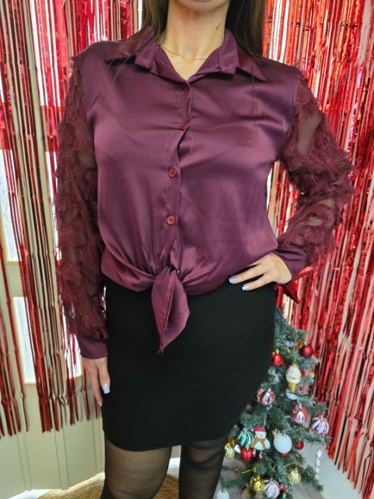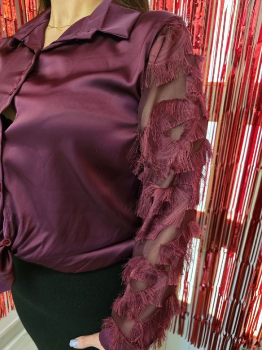 Camicia satin in due colorazioni con chiusura bottoni, manica lunga con fantasia frange.