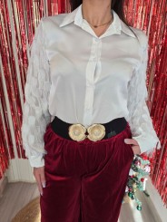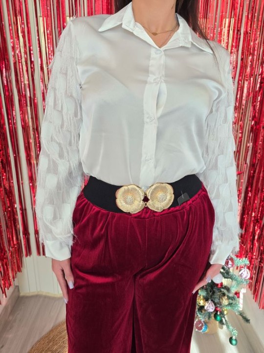 Camicia satin in due colorazioni con chiusura bottoni, manica lunga con fantasia frange.