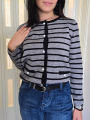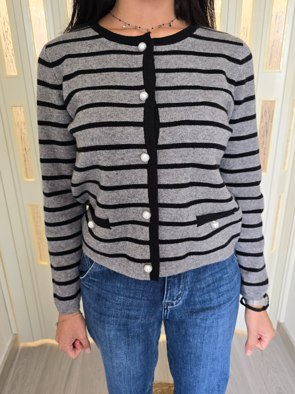 Cardigan maniche lunghe, a righe nere, chiusura con bottoni di perle. Tasche finte.