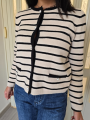 Cardigan maniche lunghe, a righe nere, chiusura con bottoni di perle. Tasche finte.