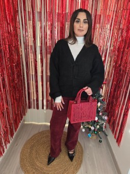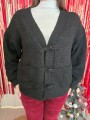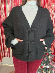 Maxi cardigan nero, lavorato in maglia, scollo a V, manica lunga, con 2 tasche, chiusura con bottoni in maglia.