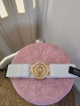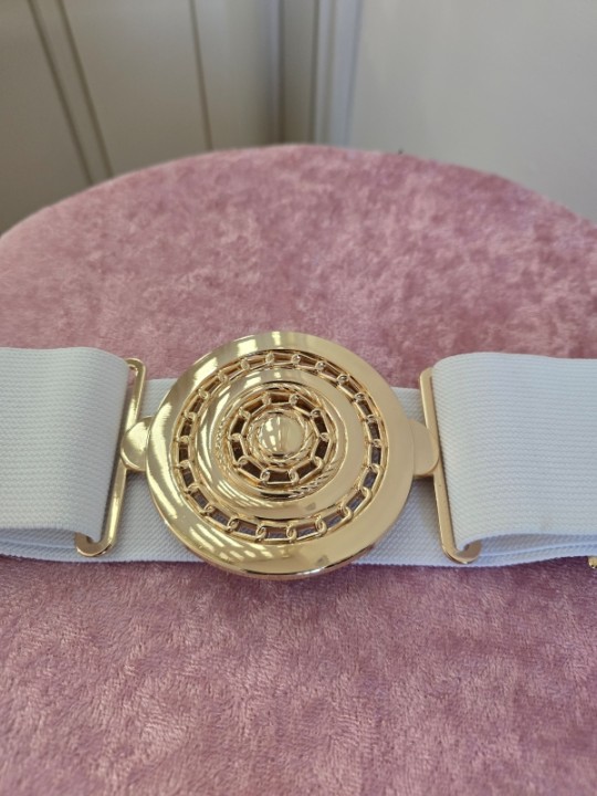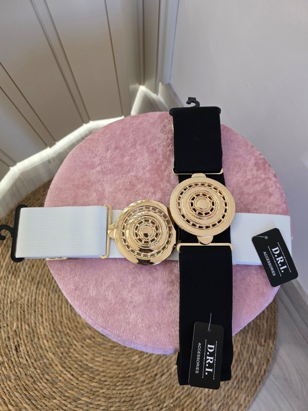 Cintura in due colorazioni: bianco e nero. Elasticizzata, con fibbia in oro a cerchio. Cintura regolabile.