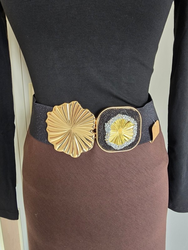 Cinturone elasticizzato con doppia fibbia decorata in oro e argento.