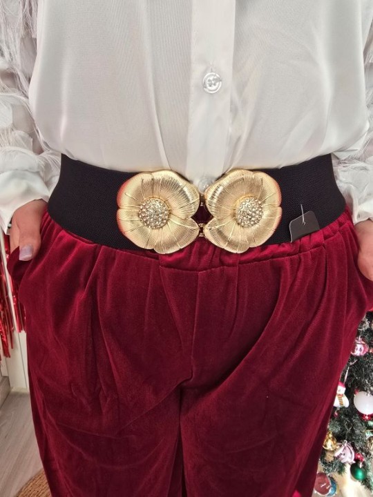Cintura nera elasticizzata con fibia composta da 2 fiori in due colorazioni: argento e oro + strass al centro.