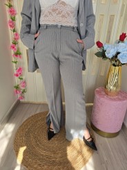 Tailleur gessato composto da giacca e pantalone. Giacca con chiusura bottone, tasche finte, fodera all'interno, cintura removibile.