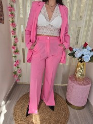 Tailleur gessato composto da giacca e pantalone. Giacca con chiusura bottone, tasche finte, fodera all'interno, cintura removibile.