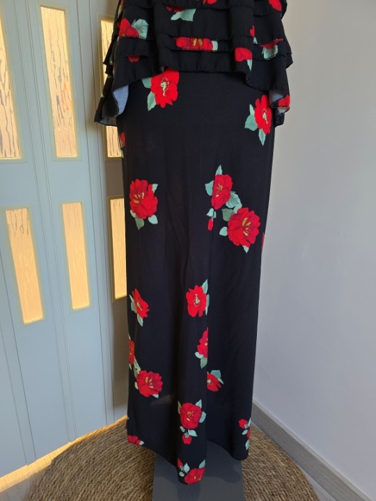 -Gonna nera lunga con fiori rossi, elasticizzata in vita.