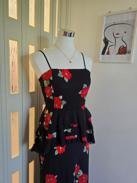 -Top nero con fiori rossi, scollatura quadrata, bretelle regolabili, orlo a balze volant, drappeggio sul retro. Elasticizzato.