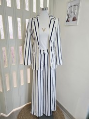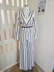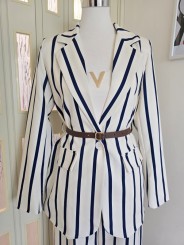 Tailleur bianco a righe larghe in blu, composto da due pezzi: