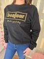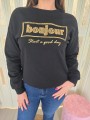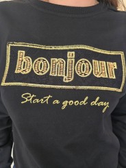 Felpa nera , manica lunga, con scritta Bonjour in oro con strass e scritta più piccola in oro. Elasticizzata.