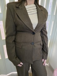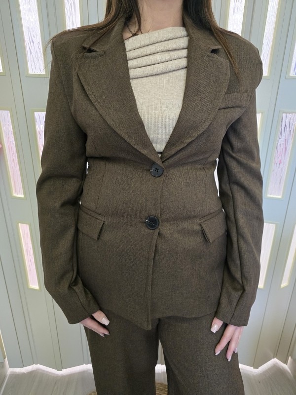 Giacca marrone, manica lunga, chiusura con 2 bottoni neri, tasche finte sul davanti. Interno foderato.