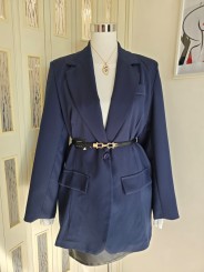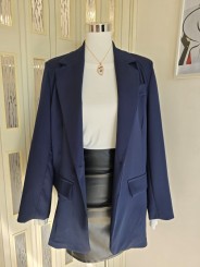 Giacca blu, manica lunga, spalle strutturate, con chiusura bottone, con tasche finte, interno foderato.