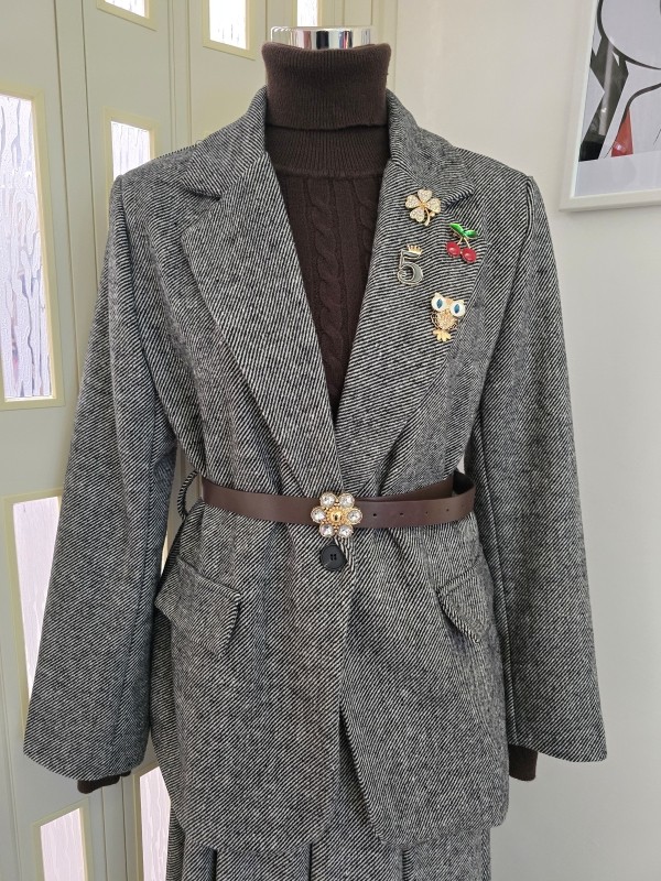 Giacca grigia in Tweed, motivo a spina di pesce grigio/nero, collo e revers ampi, di cui quello sinistro è decorato da spille gioiello di varie forme: