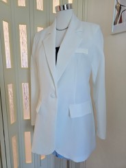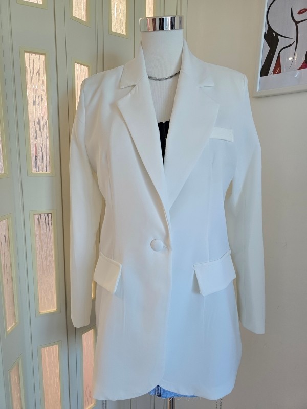 Giacca bianca, manica lunga, spalle strutturate, chiusura un bottone, patte finte, interno foderato.