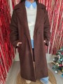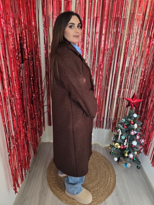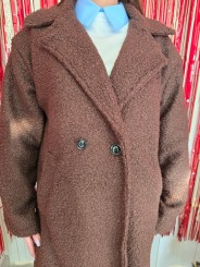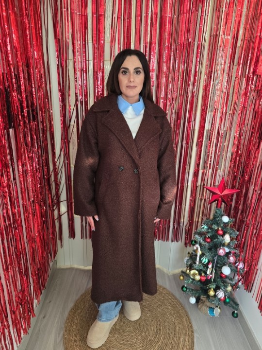Cappotto oversize lungo, effetto bouclè, con tasche, doppio bottone nero frontale, chiusura bottone singolo.