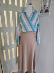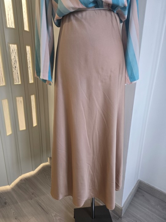 Gonna satin color champagne svasata. Elasticizzata in vita. Tessuto leggero.
