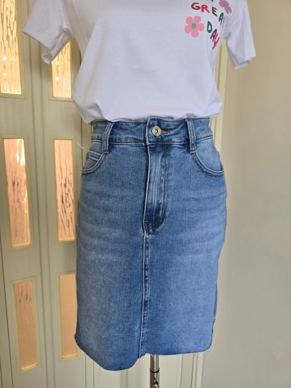 Gonna di jeans altezza sopra al ginocchio. Tasche fronte/retro, chiusura bottone.