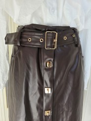 Gonna longuette in similpelle marrone scuro, con passanti in vita e cintura con fibbia in oro removibile, tasche solo su lato frontale.