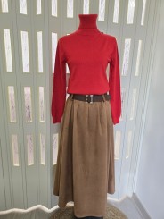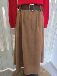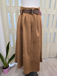 Gonna lunga a campana in camoscio, elasticizzata sul retro, con passanti e cintura marrone removibile con fibbia in oro.