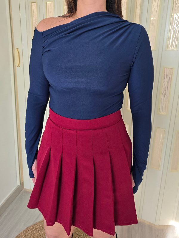 Gonna bordeaux a pieghe con chiusura zip sul retro.