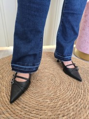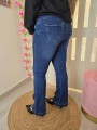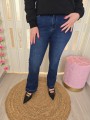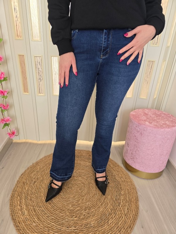 Jeans lavaggio scuro leggermente a zampa. Chiusura con zip e bottone. Elasticizzato.