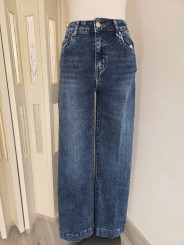 Jeans vita alta, modello a palazzo, lavaggio medio, chiusura bottone e cerniera, 4 tasche più taschino, con orlo finale alto e ben rifinito.