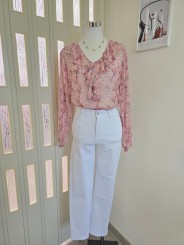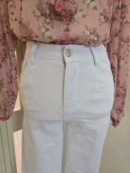 Jeans bianco, modello regolare, chiusura bottone e cerniera, passanti in vita, 4 tasche + taschino, elasticizzato.
