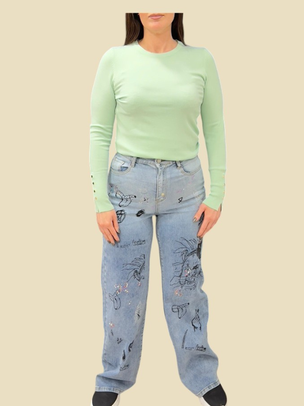Jeans fantasia con disegni + strass 98% cotone 2% elastan.